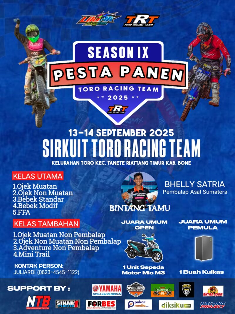 DIKSIKU.com,Bone – Ajang balap motor Pesta Panen Toro Racing Team (TRT) Season 9 siap digelar pada 13–14 September 2025 di Sirkuit TRT, Kelurahan Toro, Kabupaten Bone, Sulawesi Selatan.