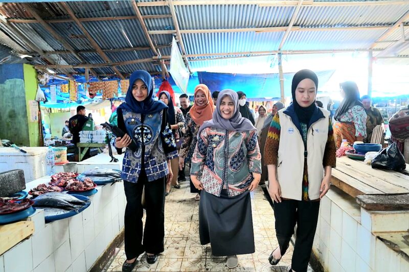 Didampingi oleh sejumlah kepala Organisasi Perangkat Daerah (OPD) dan Tim Pengendalian Inflasi Daerah (TPID), Bupati Ratnawati Arif menyusuri los-los pasar untuk berdialog langsung dengan para pedagang, sembari membagikan celemek kepada pedagang, khususnya pedagang ikan.