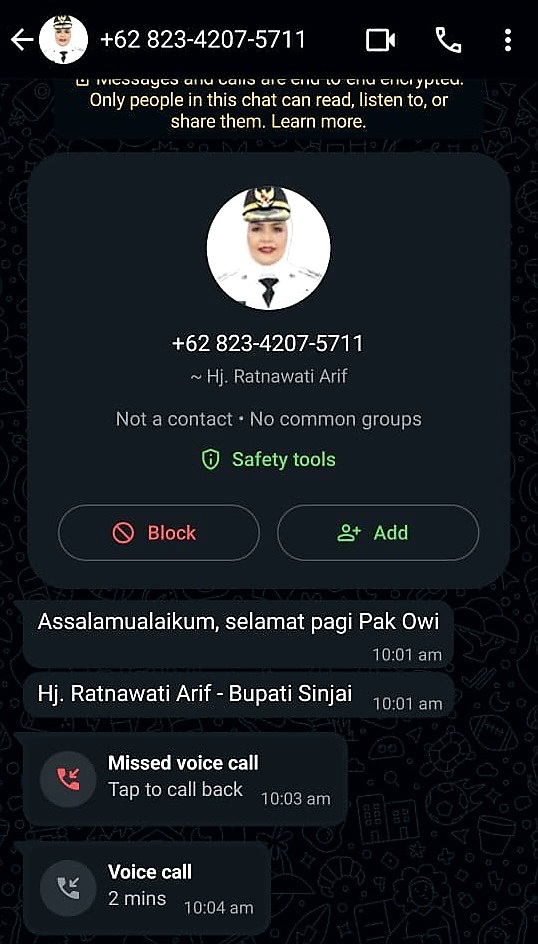 DIKSIKU.com, Sinjai – Nama Bupati Sinjai, Hj. Ratnawati Arif dicatut oleh Orang Tak Dikenal (OTK) dan mengirim pesan via Whatsapp ke sejumlah orang.