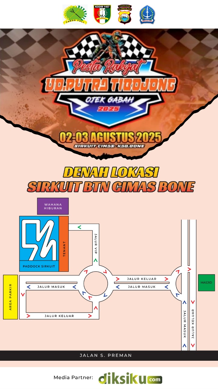 DIKSIKU. com, Bone – Panitia Pesta Rakyat UD Putra Tibojong resmi merilis denah lokasi acara spektakuler yang akan digelar pada 2–3 Agustus 2025 di Sirkuit Perumahan Bumi Cilellang Mas, Kelurahan Toro, Kabupaten Bone.