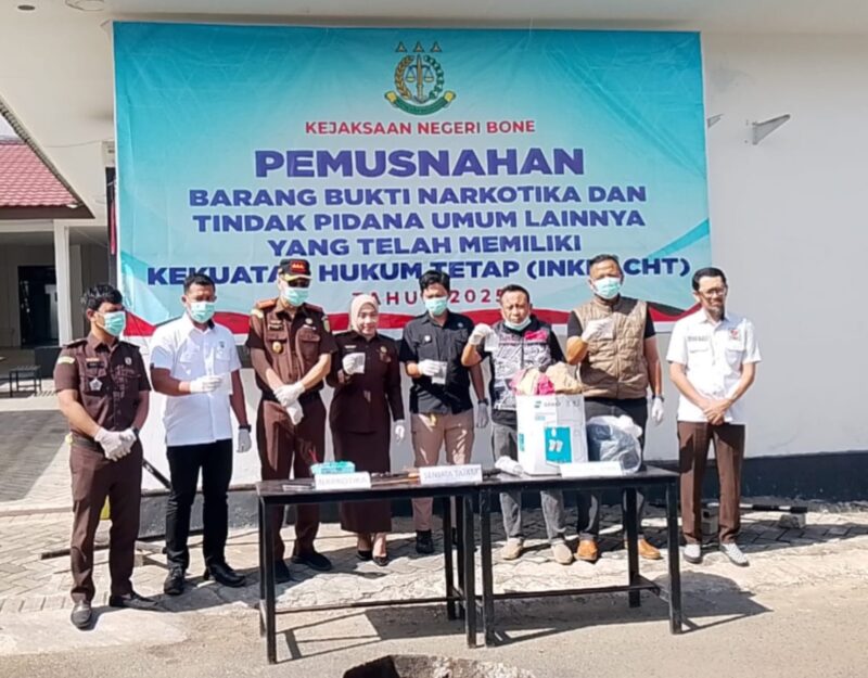 DIKSIKU.Com, Bone – Suasana halaman Kantor Kejaksaan Negeri (Kejari) Bone pada Rabu (24/9/2025. Puluhan barang bukti dari berbagai perkara pidana resmi dimusnahkan, menjadi saksi nyata komitmen aparat hukum dalam melindungi masyarakat dari ancaman kriminalitas, khususnya narkotika.