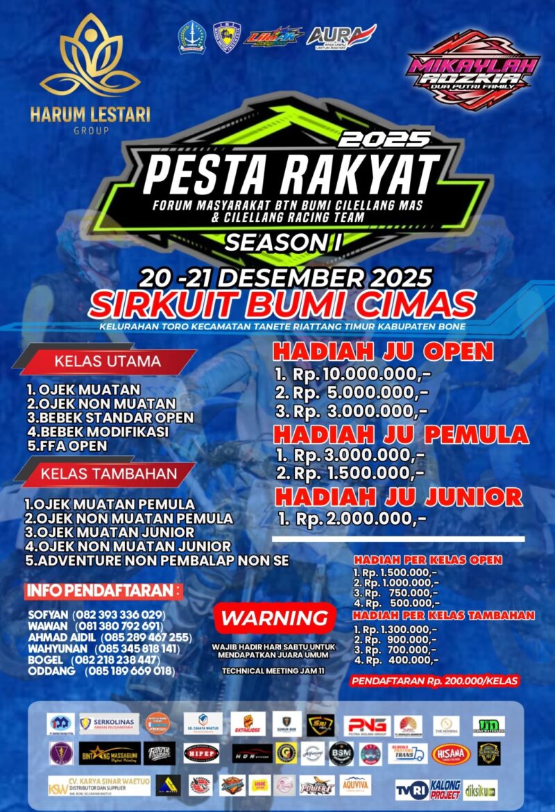 DIKSIKU.com, Bone — Gelaran Pesta Rakyat 2025 Forum Masyarakat Bumi Cilellang Mas & Cilellang Team dipastikan akan menjadi salah satu event balap paling meriah di akhir tahun. Acara yang akan berlangsung pada hari Sabtu- Minggu Tanggal 20–21 Desember 2025 di Sirkuit Bumi Cilellang Mas Kelurahan Toro Kecamatan Tanete Riattang Timur Kab Bone, Sulawesi Selatan ini bakal menyuguhkan persaingan panas para crosser dari berbagai daerah, termasuk crosser kenamaan yang sudah dipastikan ikut ambil bagian.
