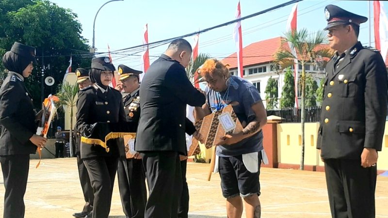 DIKSIKU.com, Sinjai – Seorang pria berpenampilan gembel, bertato, rambut pirang, bertindik, baju robek, mengenakan celan pendek yang dipakai terbalik, asesoris kalung piring plastik yang diikat tali rapia, dengan senjata kayu, menyerupai orang dalam gangguan jiwa (ODGJ) menjadi sorotan tamu undangan diacara puncak peringatan Hari Bhayangkara ke-79 di Mapolres Sinjai, Selasa (1/7/2025).
