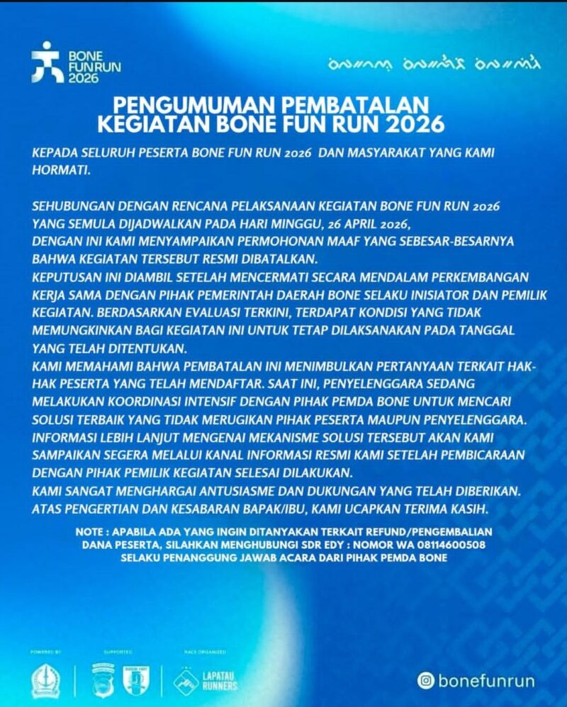 DIKSIKU.com, Bone — Kegiatan Bone Fun Run 2026 yang sebelumnya dijadwalkan berlangsung pada Minggu, 26 April 2026, resmi dibatalkan. Informasi pembatalan tersebut sebelumnya diumumkan melalui akun Instagram panitia, namun saat ini akun tersebut sudah tidak dapat diakses.